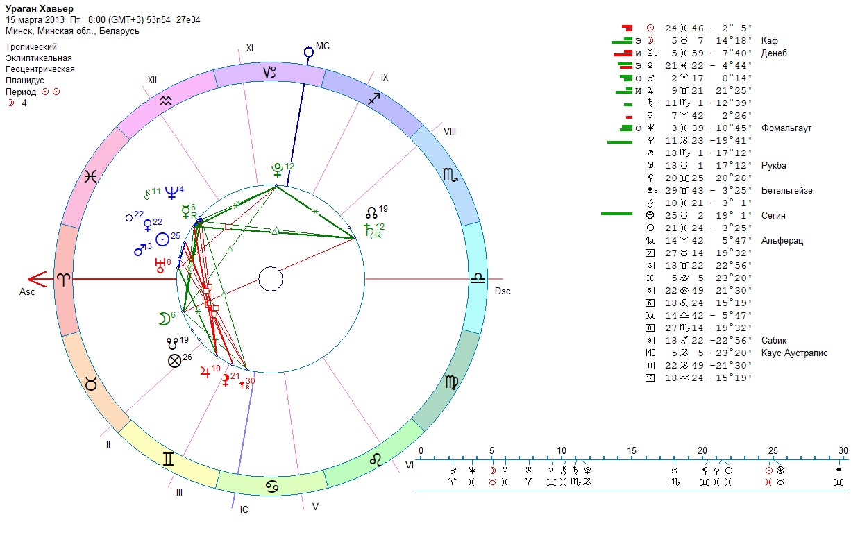 3) Ураган Хавьер, 2013: в карте дня ретро-Меркурий в Рыбах, сближающийся с Нептуном, он делает квадратуру к предыдущему осеннему затмению в 6*47' Близнецов. Орбис 1 градус, расходящийся. Узлы на день урагана стоят в градусе Меркурия в карте затмения: 18* Скорпиона. Меркурий - диспозитор того затмения, поэтому событие видимо идет по нему.